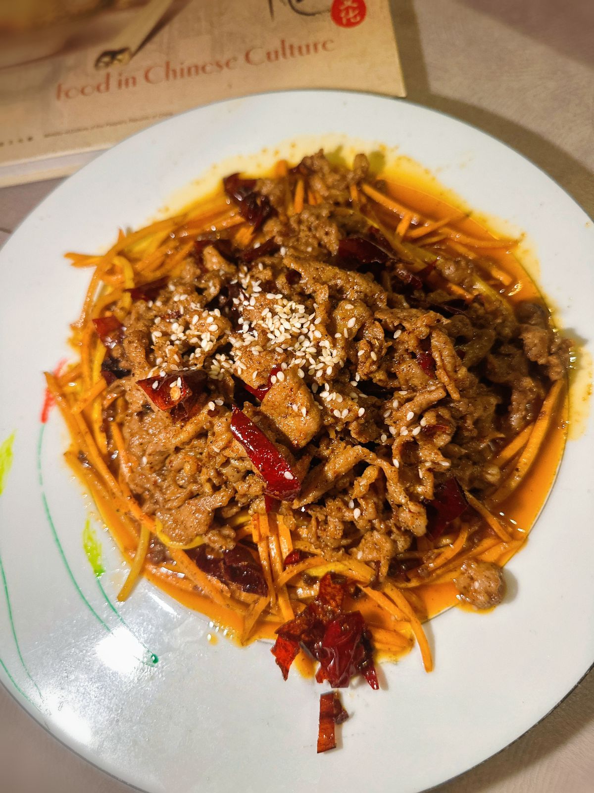 Lamelles d'agneau sautées aux graines de cumin, flocons de piment et oignons. Un plat xinjiangais audacieux, entre fumé et épicé.