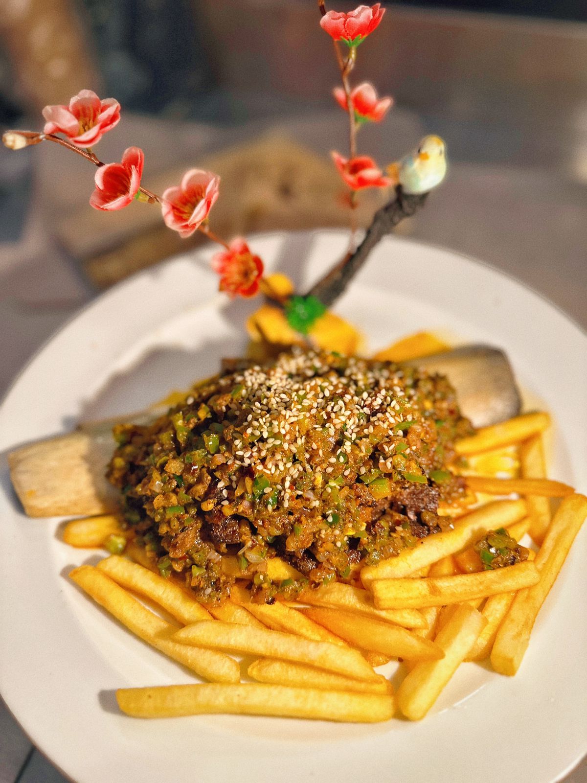 Poitrine de bœuf braisée puis frite, saupoudrée de cumin grillé, piment et ciboule. Un plat xinjiangais audacieux aux notes fumées.
