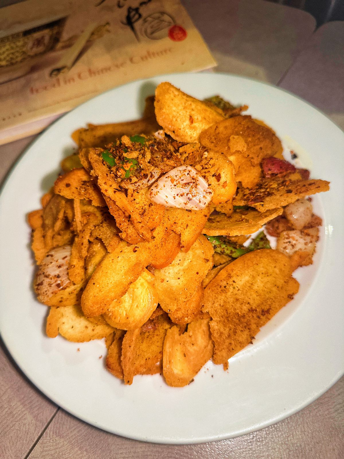 Pétales de buns chinois frits, croustillants à l'extérieur et moelleux à l'intérieur, saupoudrés d'un mélange piment-cumin. Un jeu de textures audacieux.