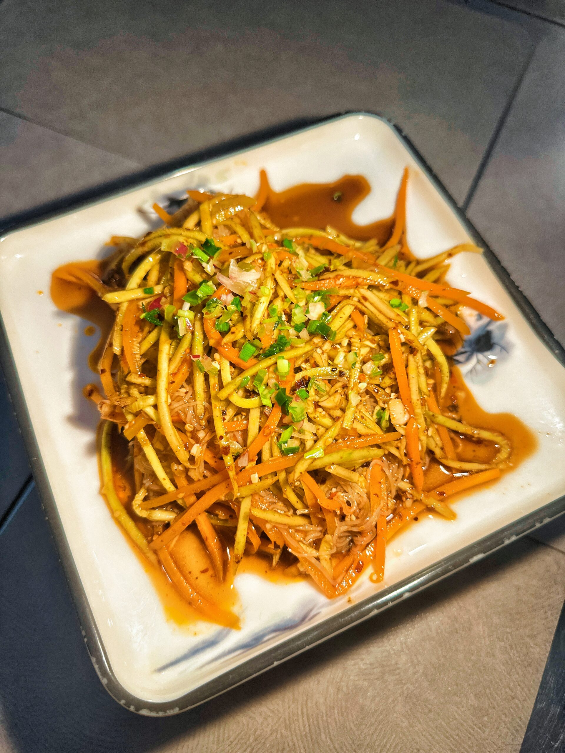 Tranches de bœuf marinées avec oignons verts, coriandre et une vinaigrette soja-sésame. Une entrée fraîche et relevée.